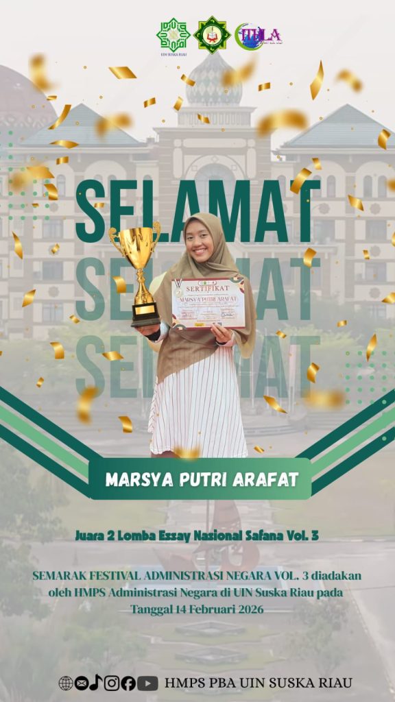 Seorang mahasiswa UIN Suska Riau kembali menorehkan prestasi membanggakan. Marsya Putri Arafat, mahasiswi semester 6, berhasil meraih Juara 2 dalam lomba esai pada ajang Safana yang ditaja oleh HMPS Administrasi Negara. Prestasi ini menjadi bukti bahwa kerja keras dan ketekunan mampu membuahkan hasil yang membanggakan.