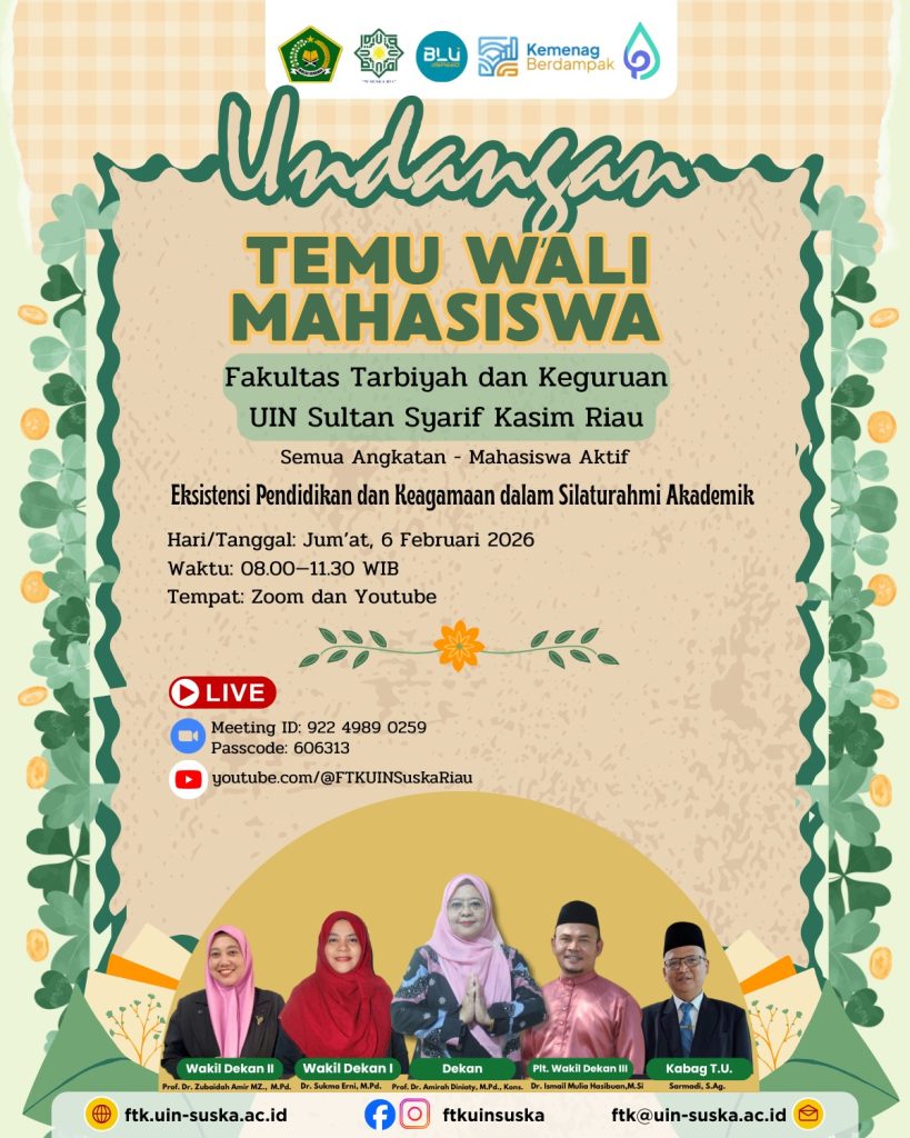 Fakultas Tarbiyah dan Keguruan UIN Sultan Syarif Kasim Riau akan menyelenggarakan Temu Ramah Fakultas dan Orang Tua/Wali Mahasiswa dengan tajuk: